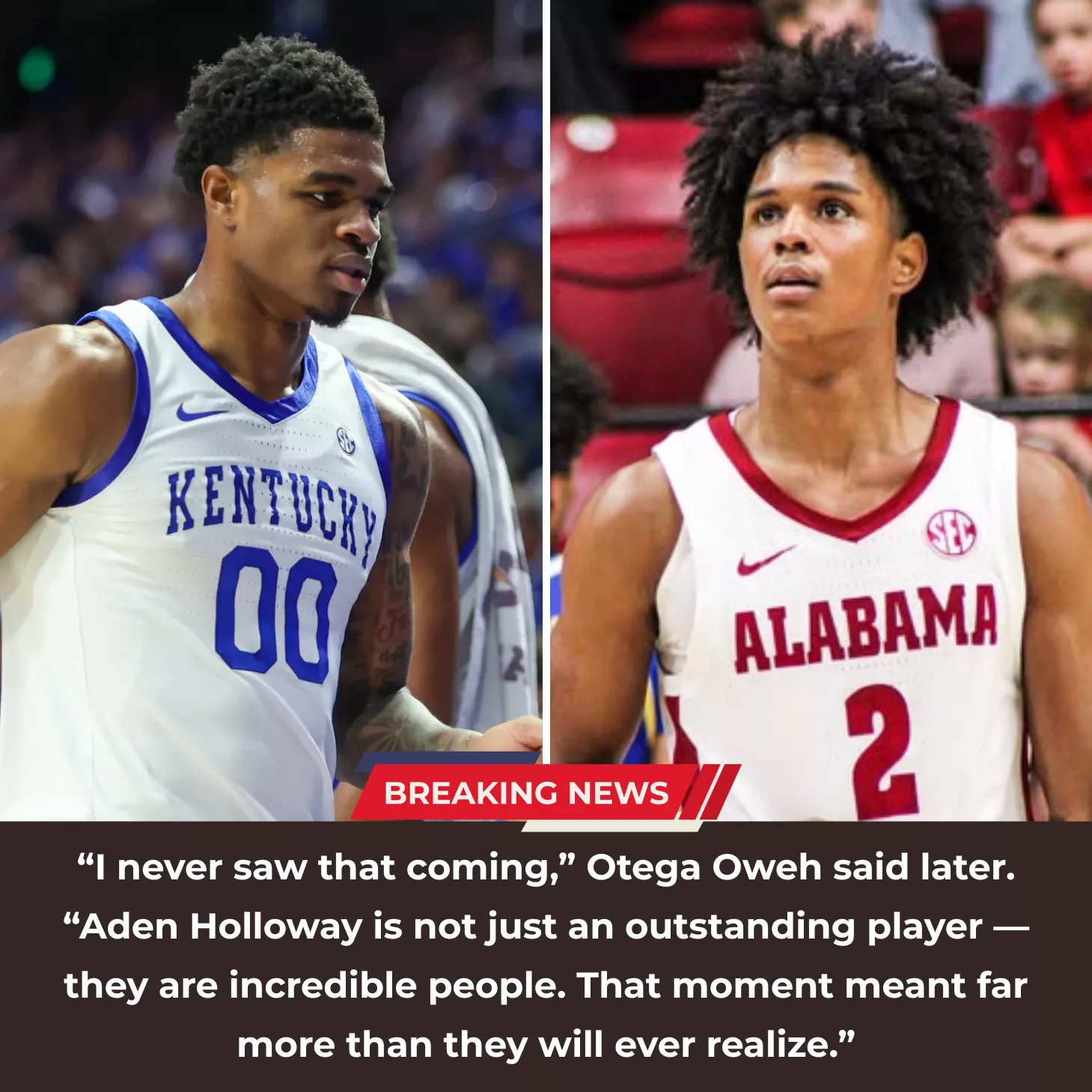 But what happened next turned that moment into something far greater than a simple loss or win. Aden Holloway, Alabama’s standout guard, broke away from the celebration. He didn’t rush toward the stands to soak in the adoration of fans. He didn’t chase headlines or bask in the glow of triumph. Instead, Holloway crossed the metaphorical “enemy lines” to find Oweh, the player whose team had just suffered defeat.
