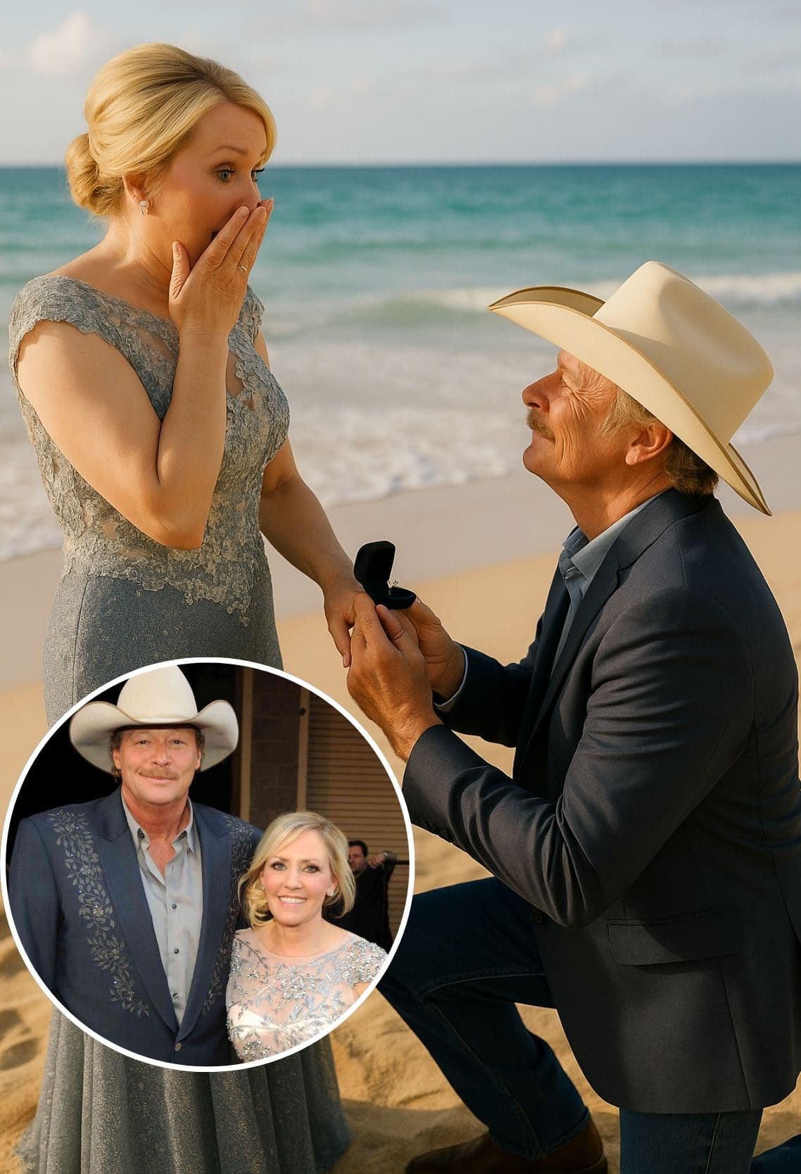 It wasn’t a concert hall or a packed stadium. There were no stage lights, no roaring applause, no encore waiting to be called. Instead, it was a quiet stretch of beach at sunset, waves rolling gently against the shore, when Alan Jackson did something that left his wife Denise — and millions of fans who would later hear the story — completely stunned.