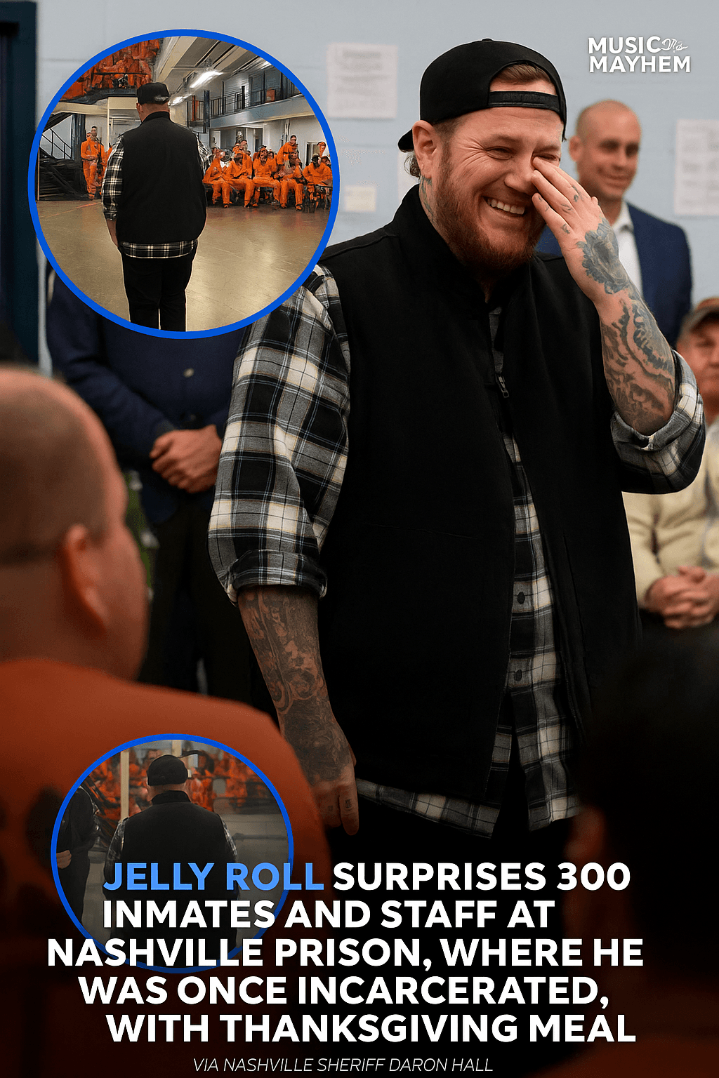 According to Nashville Sheriff Daron Hall, Jelly Roll quietly arranged a full Thanksgiving meal for around 300 inmates and staff at the same facility where he was once incarcerated. No red carpet. No press conference. Just steam rising from hot trays of turkey, stuffing, and sides – and a former inmate standing in the same halls that once held him, now as a guest of honor.
