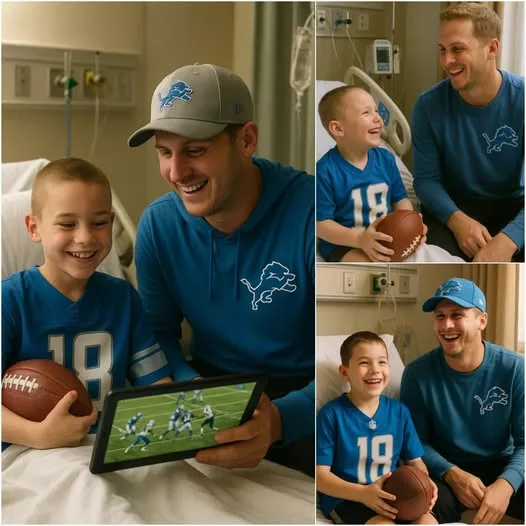 Ethan’s wish day unfolded like a movie. Goff arranged a mini Ford Field in the hospital courtyard—turf, goalposts, even the Lions’ cannon. Players Zoomed in, cheering as Ethan threw a wobbly spiral to Goff. “Touchdown!” the QB yelled, spiking a plush football.