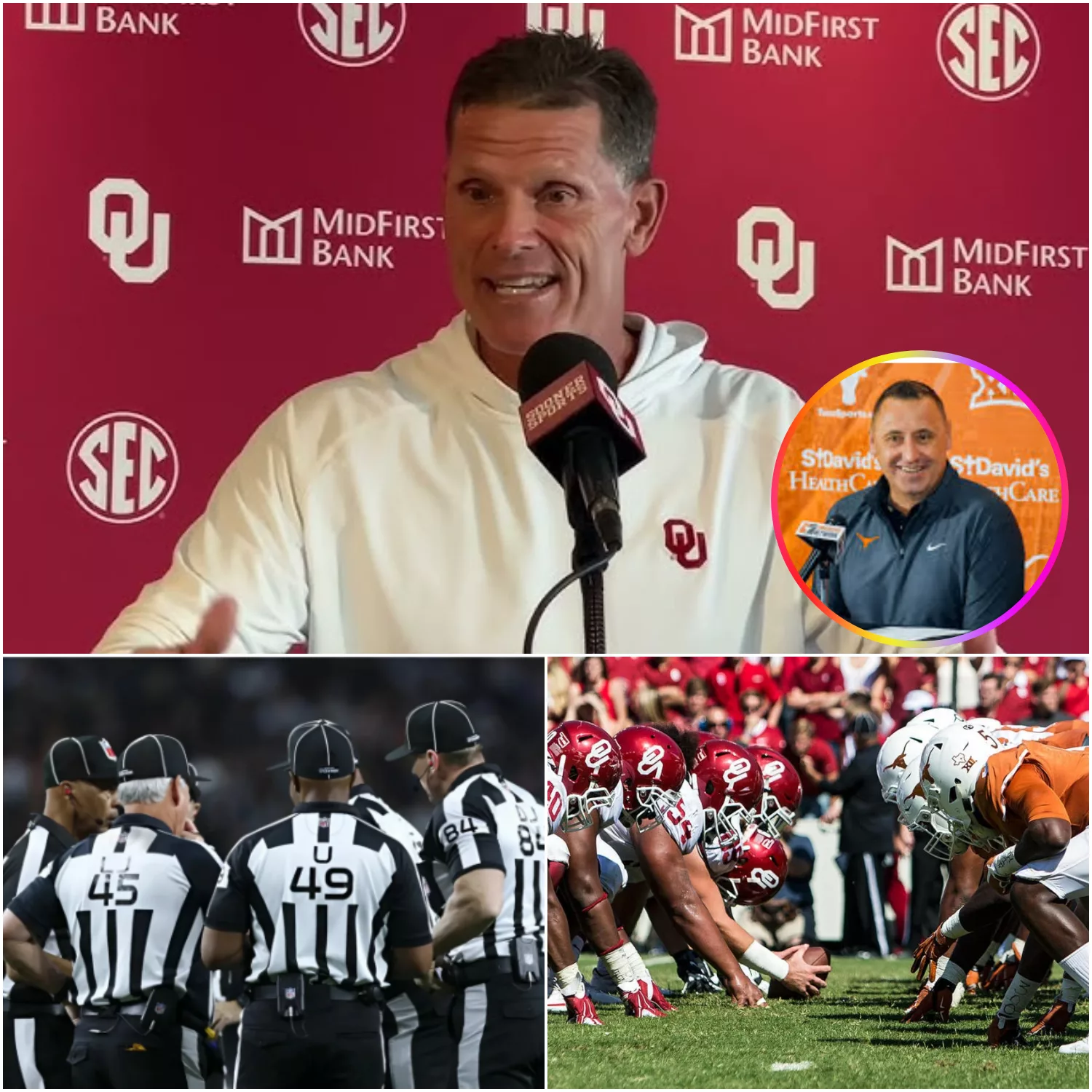 The college football world is reeling after an explosive announcement from the NCAA late Sunday night. The entire seven-man officiating crew from the Texas vs. Oklahoma game has been suspended pending investigation, following the discovery of a series of controversial calls that appeared to consistently disadvantage the Oklahoma Sooners. The fallout has been nothing short of chaotic, with head coach Brent Venables’ six chilling words sending fans into outrage and Texas head coach Steve Sarkisian’s calm smirk adding a layer of silent tension to an already volatile situation.