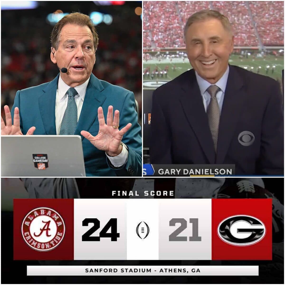 The college football world is no stranger to rivalries, heated debates, and fiery soundbites. Yet few moments have struck as hard — or gone as viral — as the one that erupted after Alabama’s 24–21 victory over Georgia. In the post-game chaos, legendary broadcaster Gary Danielson offered commentary that many saw as blatantly biased against the Crimson Tide. But it was the response from former Alabama head coach Nick Saban — a cold, nine-word warning — that has shaken both fans and media to their core.