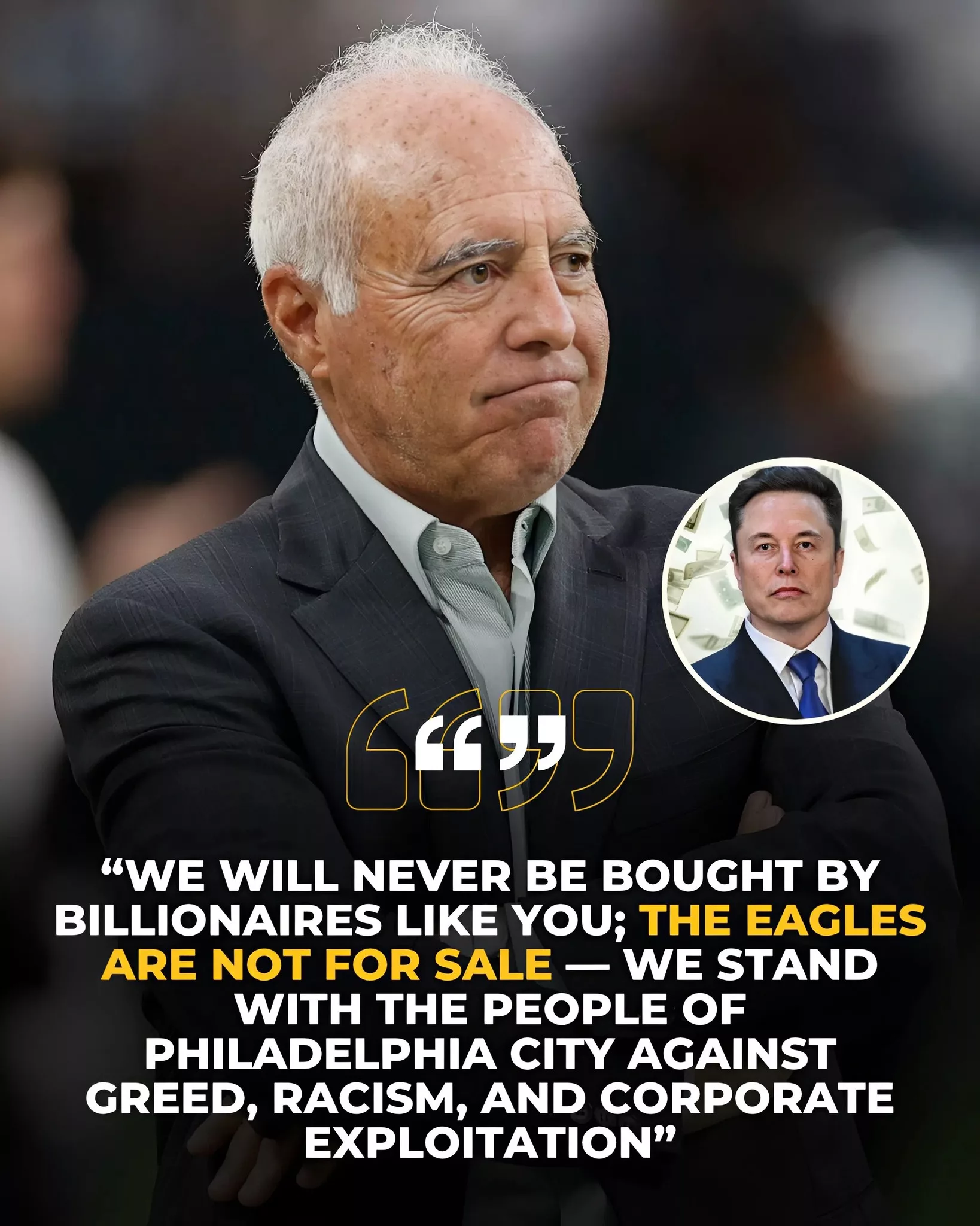 “We will NEVER be bought by billionaires like you. The Eagles are not for sale. We stand with the people of Philadelphia — against greed, racism, and corporate exploitation.”
