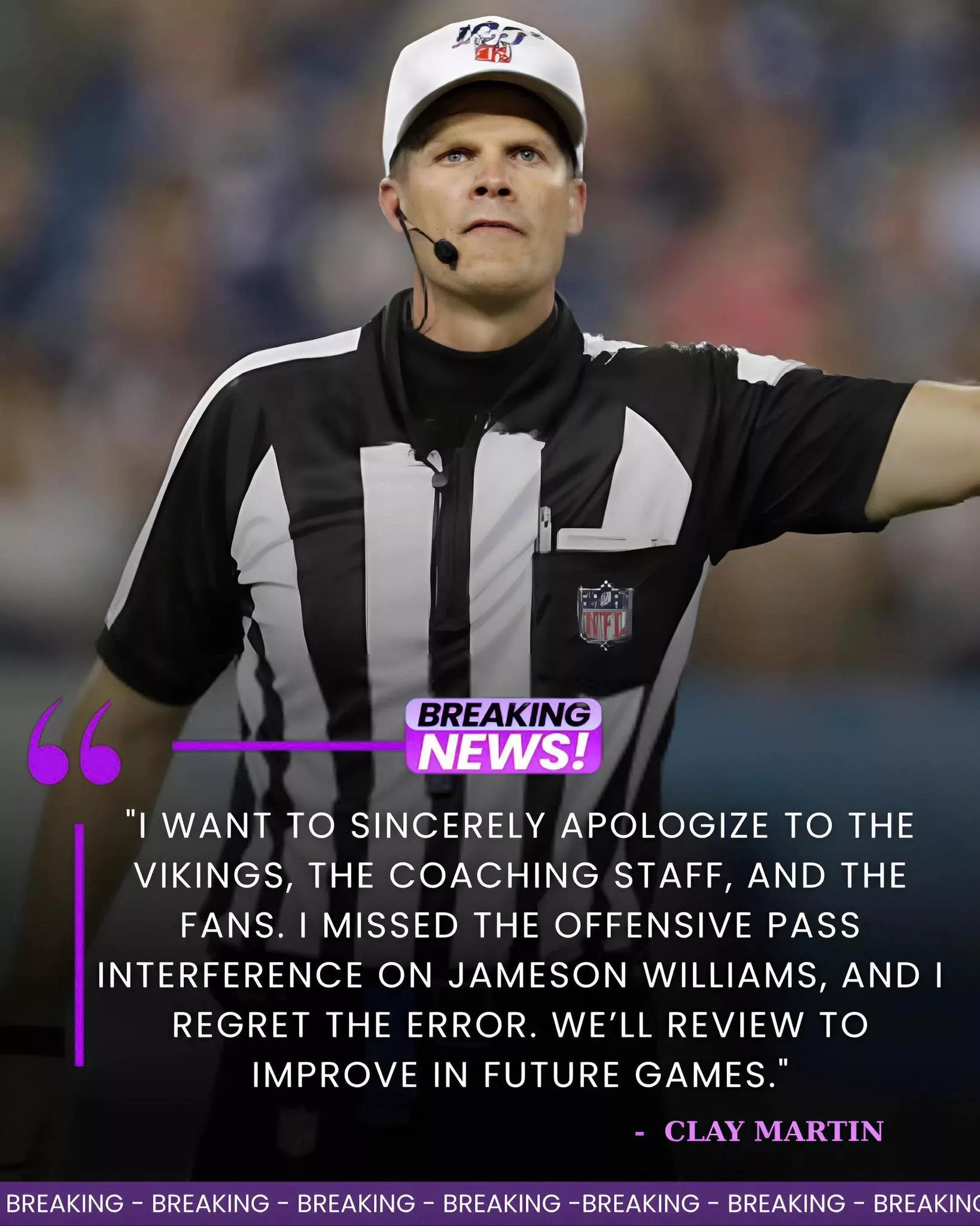 In conclusion, the apology from Clay Martin for the missed offensive pass interference by Jameson Williams has created a ripple effect throughout the NFL. It highlights the intense pressure on officials, the high stakes of every judgment call, and the growing expectation for transparency and accountability in the sport. For the Vikings, while frustration is natural, the focus remains on preparation, execution, and ensuring that future victories are earned on the field — mistakes by officials notwithstanding. This episode serves as a vivid reminder that in professional football, every play counts, and even minor oversights can become headline-making moments that shape conversations long after the final whistle.