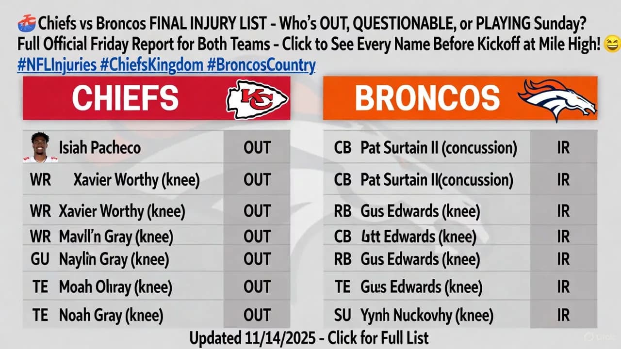 In this deep dive, we’ll break down the official lists for both teams, highlight the biggest impacts, and explore how these absences could swing the game. Whether you’re a die-hard Chiefs Kingdom member plotting Travis Kelce’s fantasy explosion or a Broncos Country faithful praying for Bo Nix to outduel the two-time MVP, this report has you covered. Let’s dissect the damage—because in the AFC West, every snap counts.