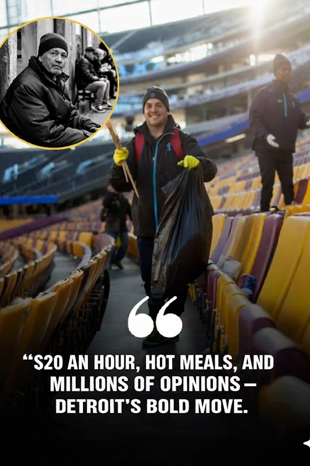 In a move that has already captured national attention, the Detroit Lions have unveiled an unprecedented initiative that goes beyond football. After each weekend game, the team is hiring homeless workers to clean the stadium, offering $20 an hour along with hot food and drinks. What might seem like a simple act of labor management has proven to be a powerful gesture of dignity, opportunity, and social responsibility.