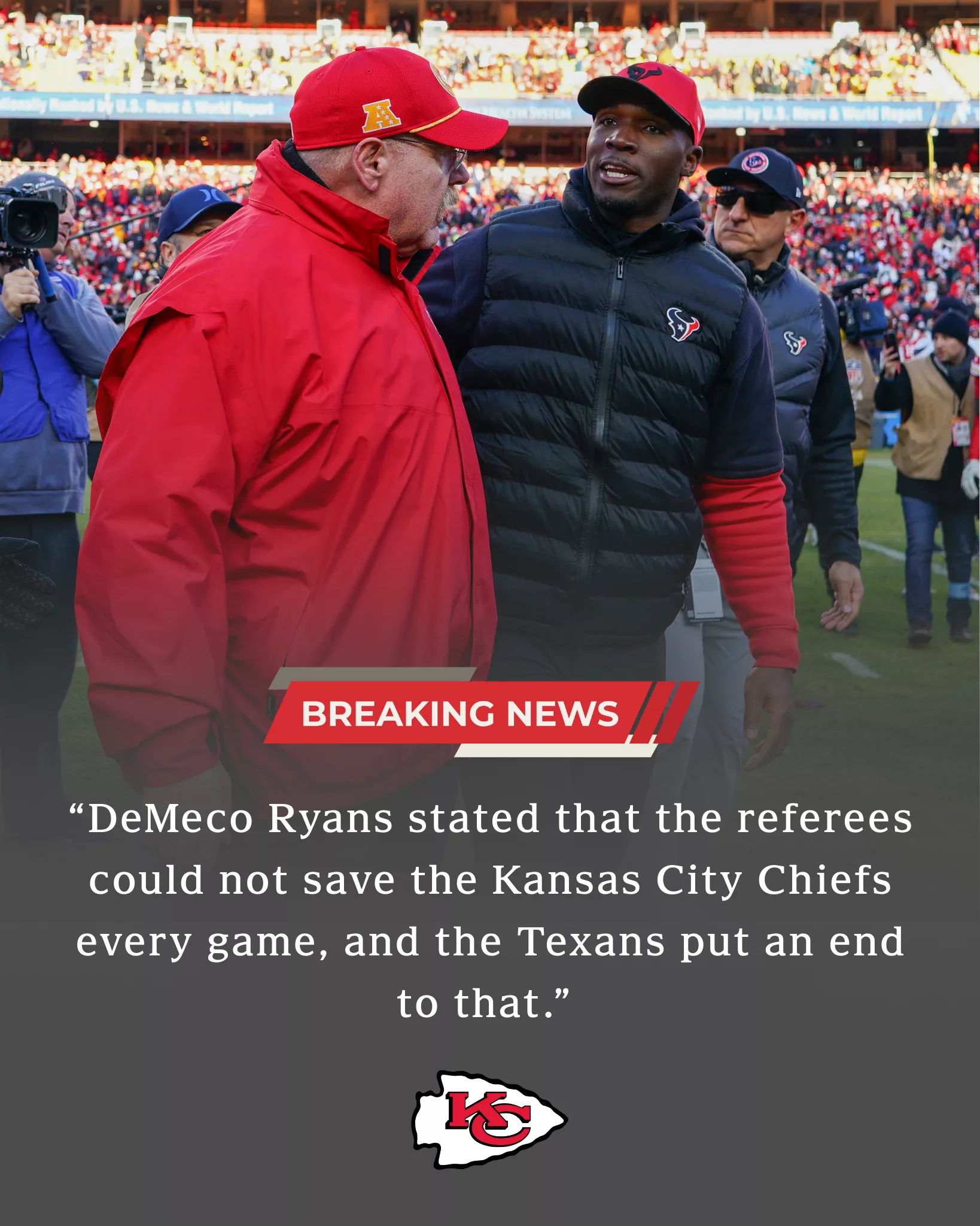 Reid’s response masterfully shifted the focus from external factors (referees) back to the internal excellence of the Chiefs organization (championships and Lombardi Trophies). By referring to Ryans as “young DeMeco,” Reid patronized the Texans coach, suggesting his comments were born of inexperience and a need to grasp for excuses rather than a true understanding of what builds a dynasty. It was a powerful reminder that while the Texans may have won one battle, the Chiefs have won the war, repeatedly. His focus on “championship plays” subtly dismissed the Texans’ regular-season win as irrelevant to the bigger picture.