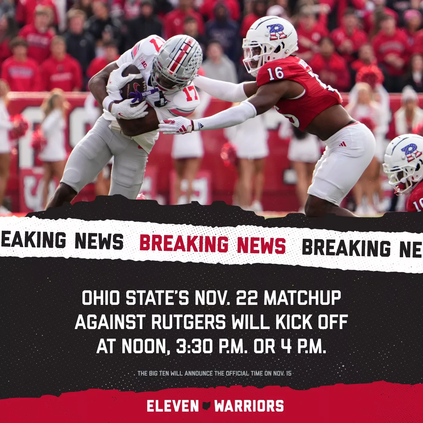 According to multiple reports, an Ohio State spokesperson confirmed that for the Nov. 22 game against Rutgers, the kickoff time will fall into one of three possible windows: noon, 3:30 p.m. or 4:00 p.m. Eastern Time. WKEF+1 The Big Ten apparently is using one of its allotted six-day scheduling windows (during which it finalizes certain kickoff times for its network-televised games) and thus is withholding the official kickoff announcement until late in the week. Eleven Warriors+1 Importantly, the game will not be a true night game; it is unlikely to kick off under the lights at 7:00 p.m. or later. WKEF+1