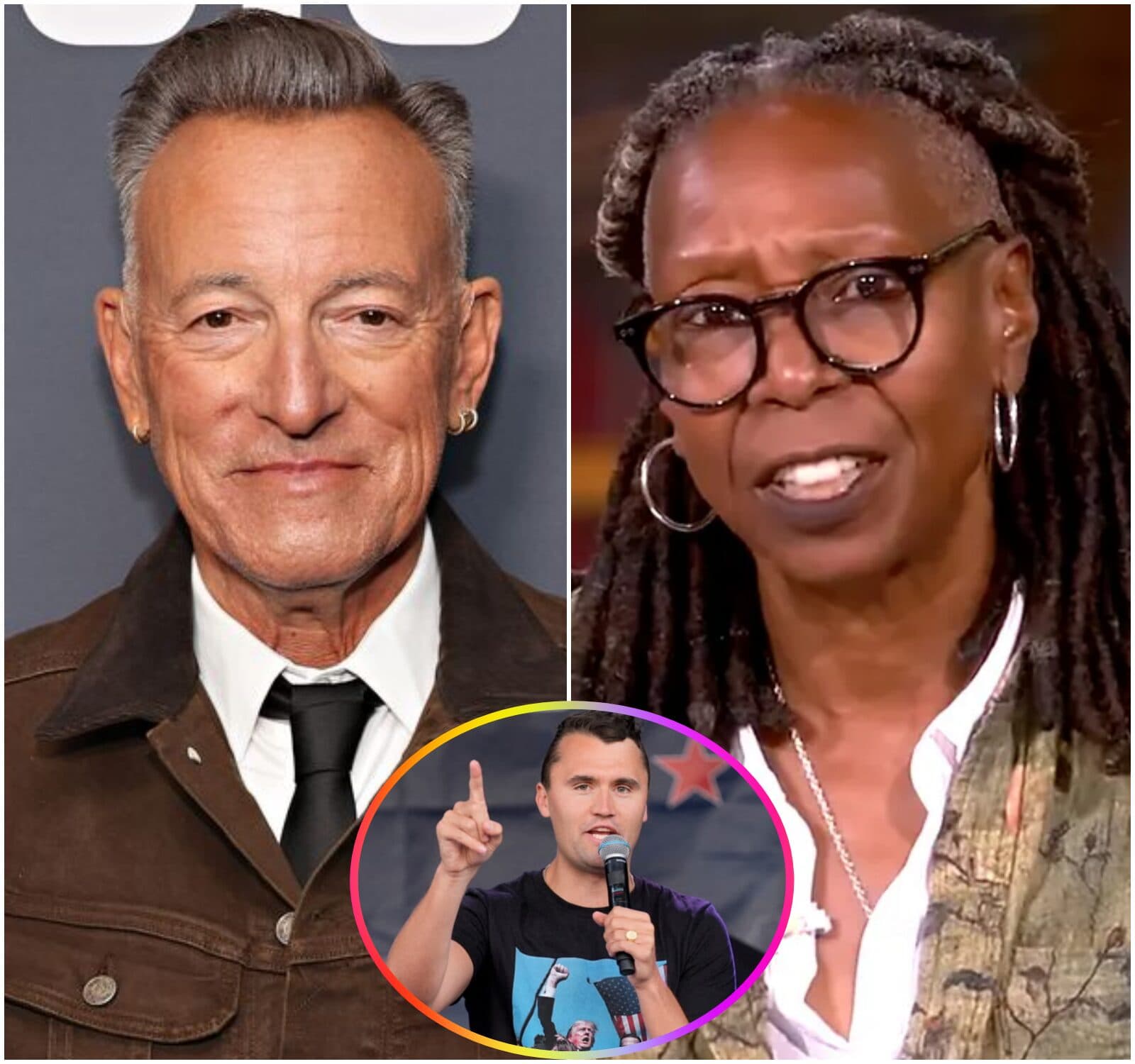 The spark came after Whoopi Goldberg’s shocking outburst, words that had already divided a nation still grappling with loss. The cameras swung quickly to Springsteen. Studio lights bathed him in raw, iconic presence: wild, unkempt hair framing a face lined with time and truth, a weathered man whose aura as “The Boss” of American rock still burned fiercely. His hands trembled — not with fear, but with something deeper. Anger. Loyalty. Loss. Charlie Kirk was gone, and the pain of that absence lingered everywhere. Yet in that instant, live on air, Bruce Springsteen chose his moment.