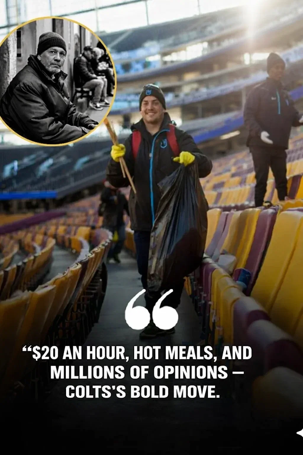 In a bold move that has already captured national attention, the Indianapolis Colts have announced a groundbreaking initiative aimed at empowering some of the city’s most vulnerable residents. After each weekend game, the Colts will hire homeless workers to clean the stadium, paying $20 an hour and providing hot food and drinks. What might appear to be a simple operational decision is, in reality, a profound act of social responsibility, dignity, and community empowerment.