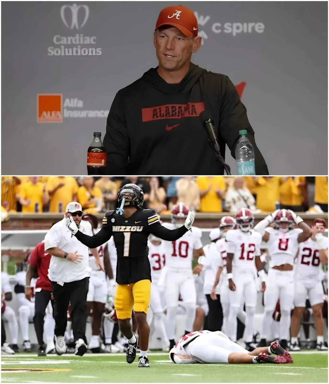 The tension inside the post-game press conference room was palpable. Alabama head coach Kalen DeBoer, usually composed and measured, was visibly furious — and he made no attempt to hide it. The Crimson Tide had just survived a grueling battle against Missouri, escaping with a narrow 27–24 victory. But the conversation wasn’t about the win, the playoff implications, or even Alabama’s SEC title hopes. It was about one moment — a brutal collision that left star wide receiver Derek Meadows motionless on the turf and sent shockwaves through college football.