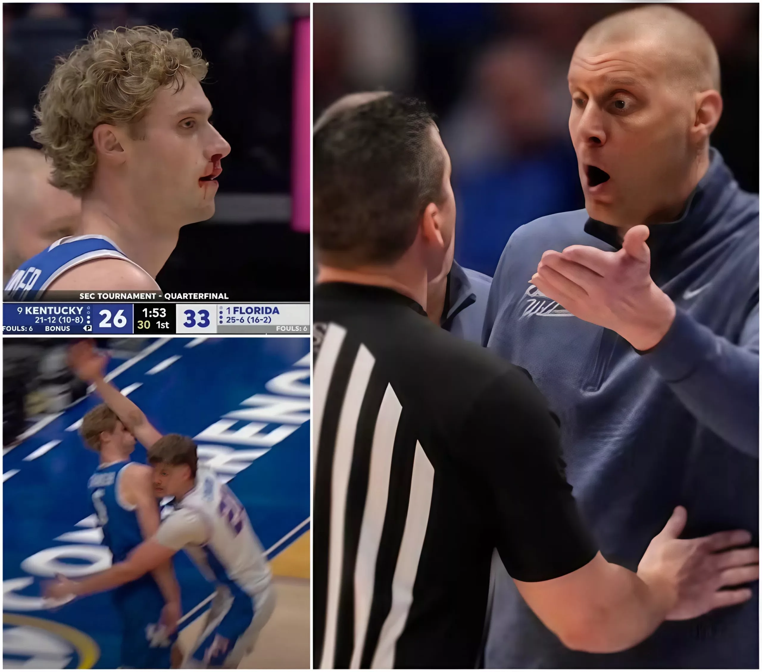 Midway through the second half, a play that initially looked routine quickly turned into something far more alarming. As players battled for position, contact escalated beyond what many observers would consider a normal basketball play. When the dust settled, a Kentucky player was left walking toward the sideline with blood streaming from his nose, the result of a collision that many on the Wildcats’ bench believed should have drawn a whistle.