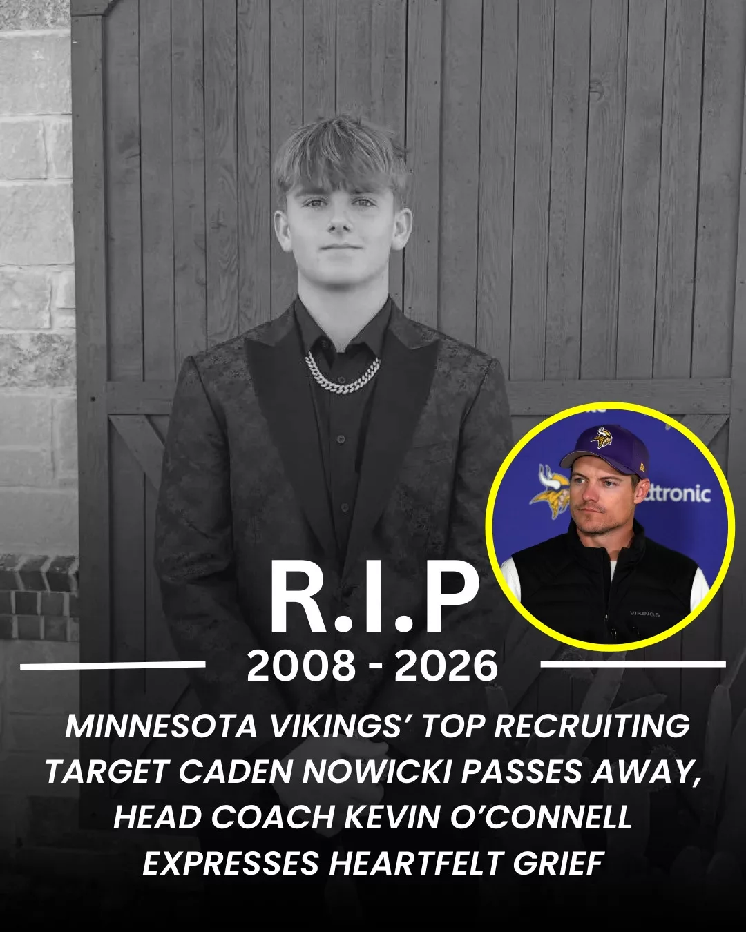 The football world has been shaken by devastating news. Caden Nowicki, one of the most promising young athletes closely linked to the future plans of the Minnesota Vikings, has tragically passed away following a devastating accident. His death has sent shockwaves through the Vikings organization, recruiting circles, and the broader sports community, leaving behind grief, disbelief, and a profound sense of loss.