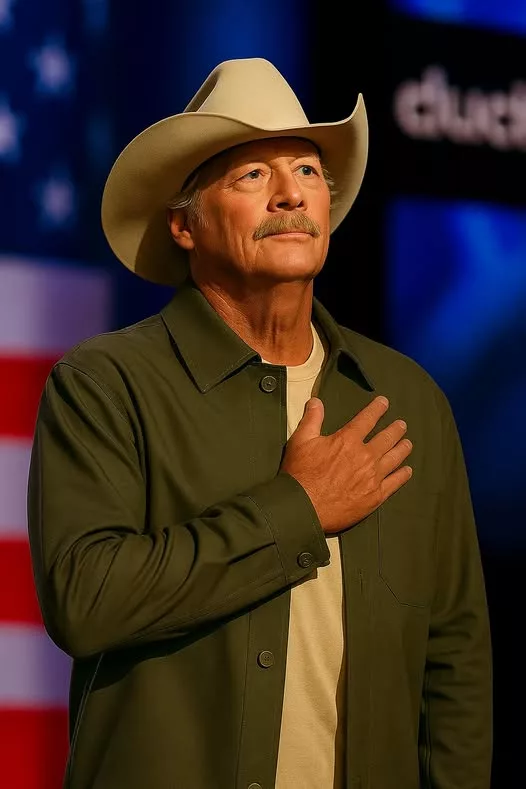 There were no guitars, no drums, no flashing lights — just Alan, dressed simply, standing beneath the American flag with his hand over his heart.