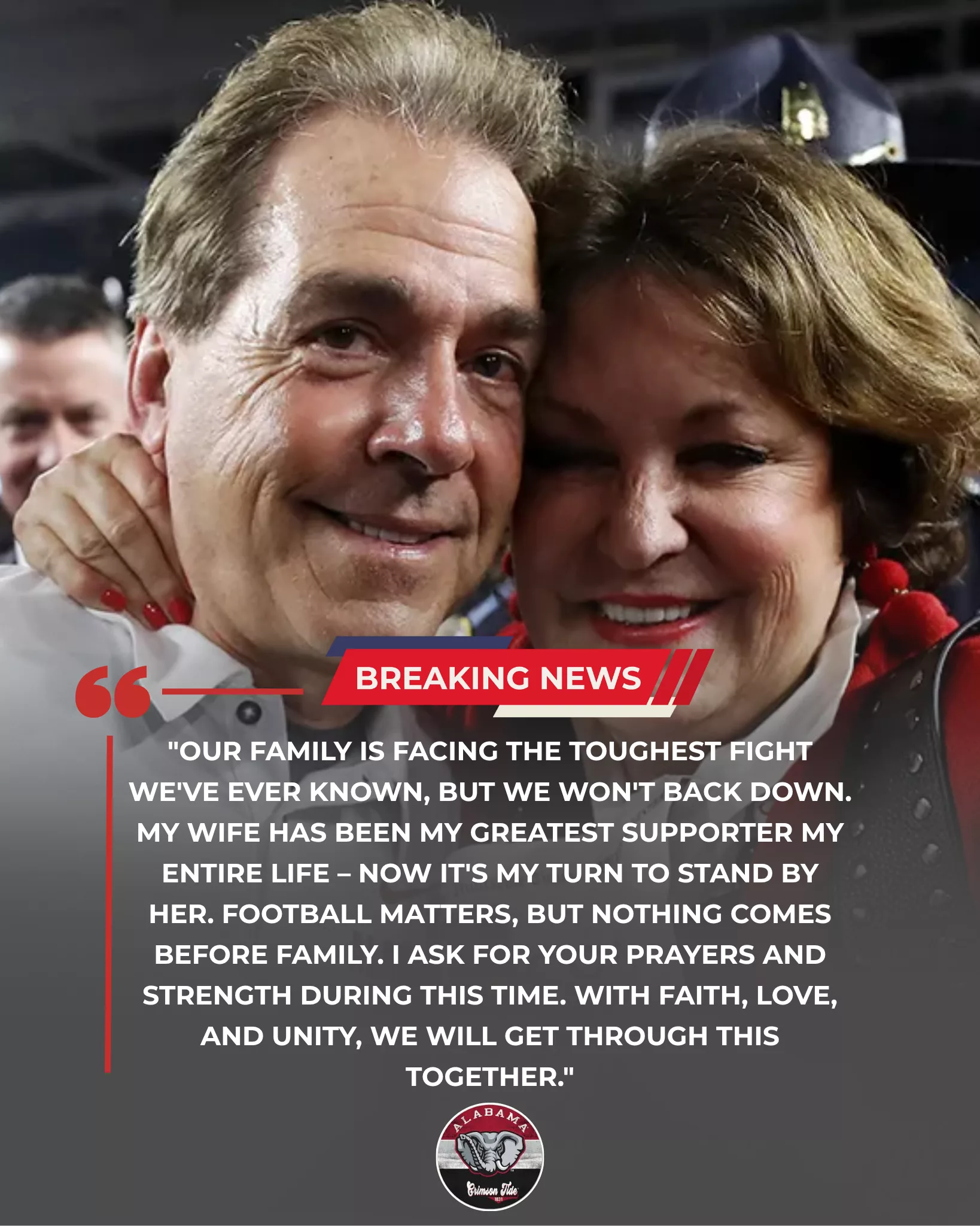 Nick Saban, the 73-year-old coaching icon who retired in January 2024 after 17 seasons at Alabama, appeared alongside Miss Terry at a low-key press gathering outside their Tuscaloosa home. Dressed in his signature crimson polo, the stoic tactician who once orchestrated dynasty after dynasty broke down in tears – a sight that silenced the room. “Terry’s my everything,” Saban said, his voice barely above a whisper, gripping her hand tightly. “She’s fought beside me through championships, rebuilds, and everything in between. Now, it’s my turn to fight for her. This… this ain’t about football anymore. It’s about beating this thing, whatever it takes. Bama fans, y’all know family comes first. Pray for us, yeah? We’re gonna need it.” The coach’s eyes, usually laser-focused on X’s and O’s, welled up as he paused, adding, “She’s tougher than any defense I’ve ever schemed against. But damn, this hurts.”