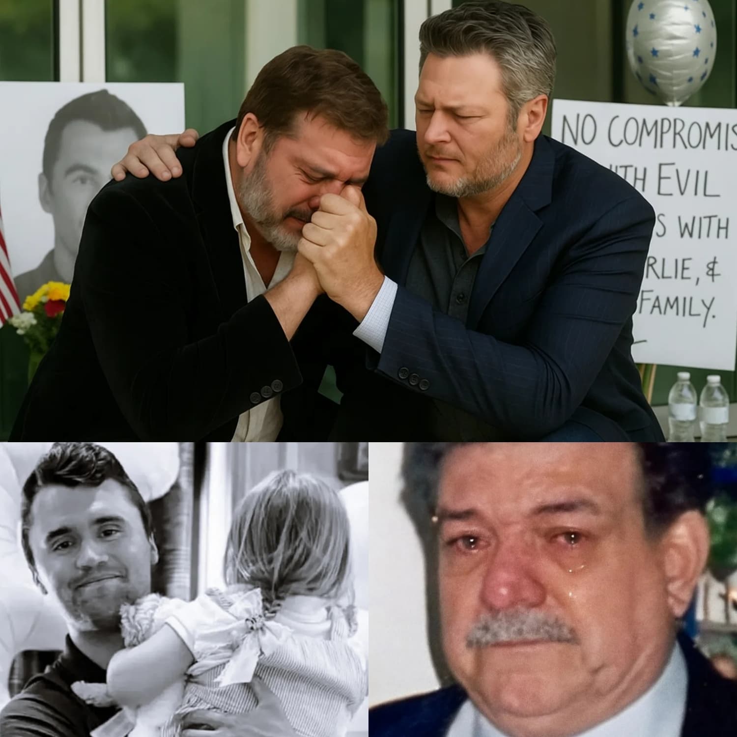 Charlie Kirk’s father collapsed to the ground, overcome by the sheer weight of loss. Around him, people scrambled to help, but one figure stood out — Blake Shelton, the country music superstar and long-time friend of Kirk. Shelton gently placed a hand on the grieving father’s shoulder, offering a quiet strength that seemed to anchor the chaos surrounding them.