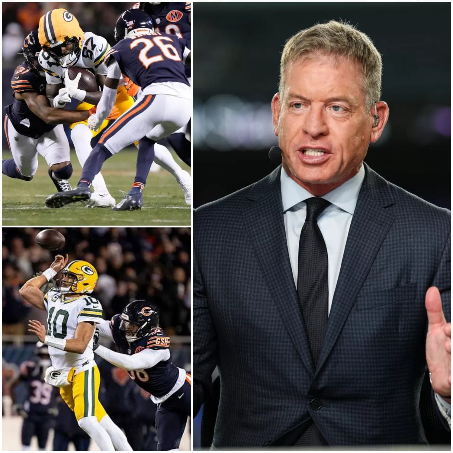 Cowboys legend and longtime NFL analyst Troy Aikman sent shockwaves through the football world after making stunning comments on live television, claiming that the Chicago Bears were clearly favored by the officials in their controversial victory over the Green Bay Packers. In unusually blunt language, Aikman went as far as calling the outcome of the game “disgraceful,” while publicly urging the NFL to investigate what he described as three serious incidents of potential game manipulation.