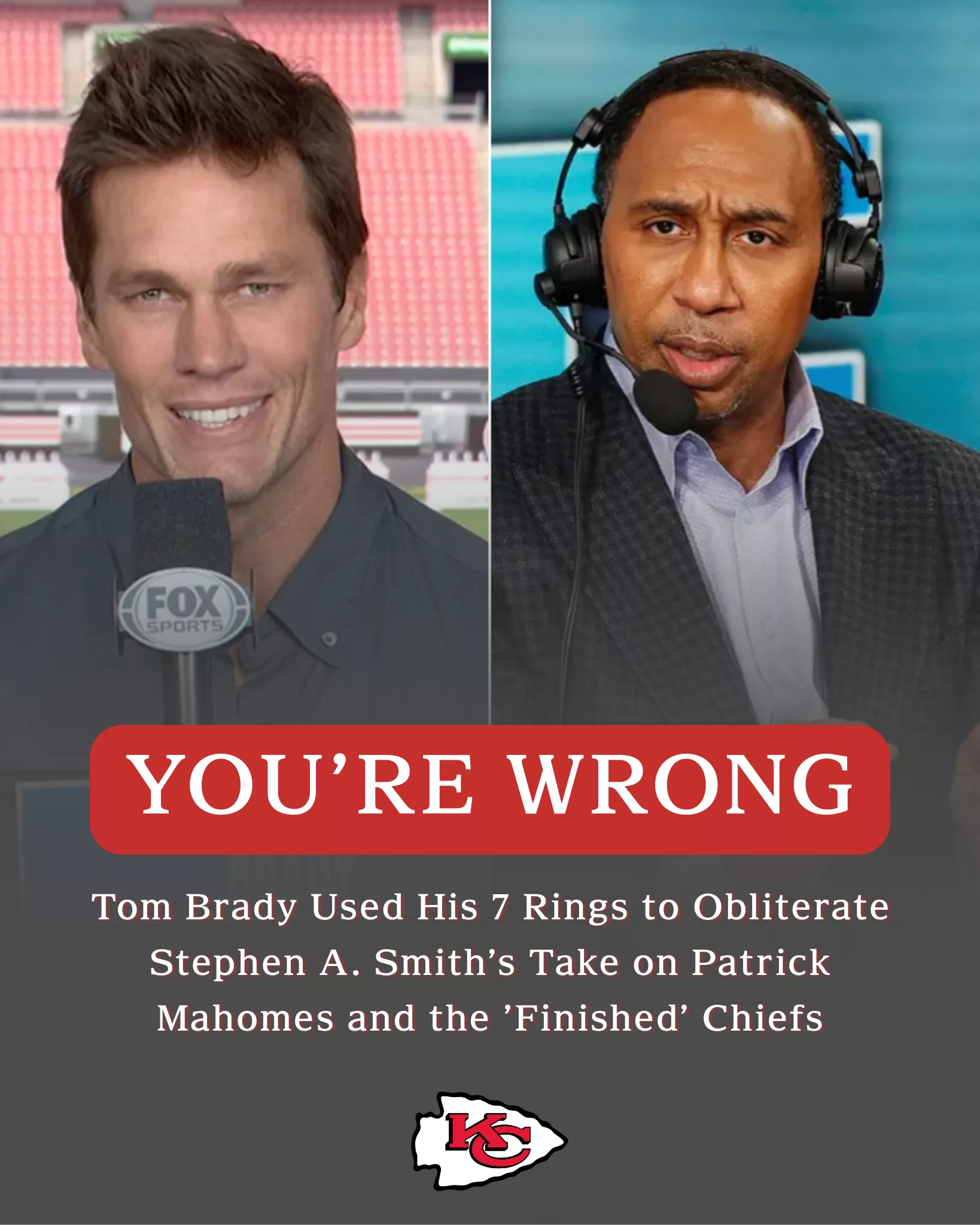 In the electric theater of sports television, few moments are more compelling than when the greatest player in history decides to personally shut down the game’s loudest critic. That moment arrived this Tuesday, delivering a seismic shockwave across the NFL media landscape. Appearing live on ESPN’s First Take, Tom Brady, the seven-time Super Bowl champion, utilized the full weight of his unparalleled legacy—his “7 Rings”—to launch a surgical, powerful counter-attack, completely obliterating Stephen A. Smith’s recent scathing declaration that the Kansas City Chiefs dynasty was “finished.”